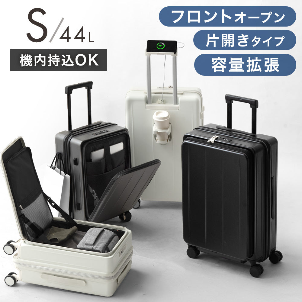 おはようございます!スタッフのともです!今回は「片開き キャリーケース」をご紹介させていただきます。こちらのキャリーケースは、一般的な両開きタイプと比較して、約半分のスペースで物の出し入れができるため、空港や駅などでもスムーズにご利用いただけます。また、フロント部分には収納スペースもあるため、PCやパスポートを必要なときにすぐに取り出すことができます。他にも、充電ポートやドリンクホルダー、ダブルキャスターなど、魅力的な機能が満載です!ぜひチェックしてみてくださいね!