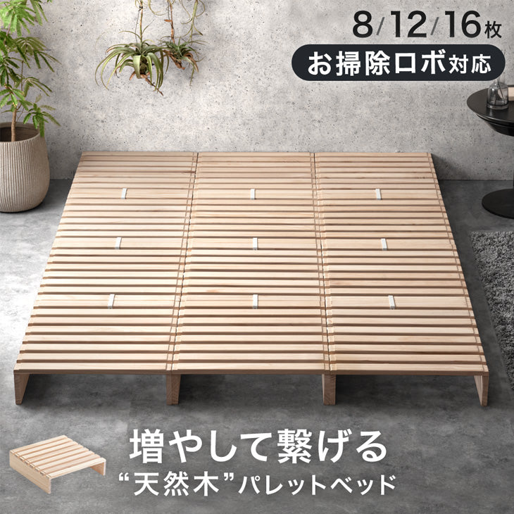 おはようございます!スタッフのコです。本日ご紹介するのはTVCMでも紹介中「増やして繋げる天然木パイン パレットベッド」です。ワンタッチ連結で簡単に固定でき、使わない時は重ねて省スペース収納もOK!8・12・16枚から選べ、家族構成やお部屋の広さに合わせて自由にレイアウト可能です。お掃除ロボ対応の11cm脚高設計で、毎日のお掃除も快適!通気性の良いすのこ構造で、1枚あたり約2kgと軽量、移動や組み替えもラクラクです。暮らしの変化に柔軟に寄り添う一台として、ぜひチェックしてみてくださいね。