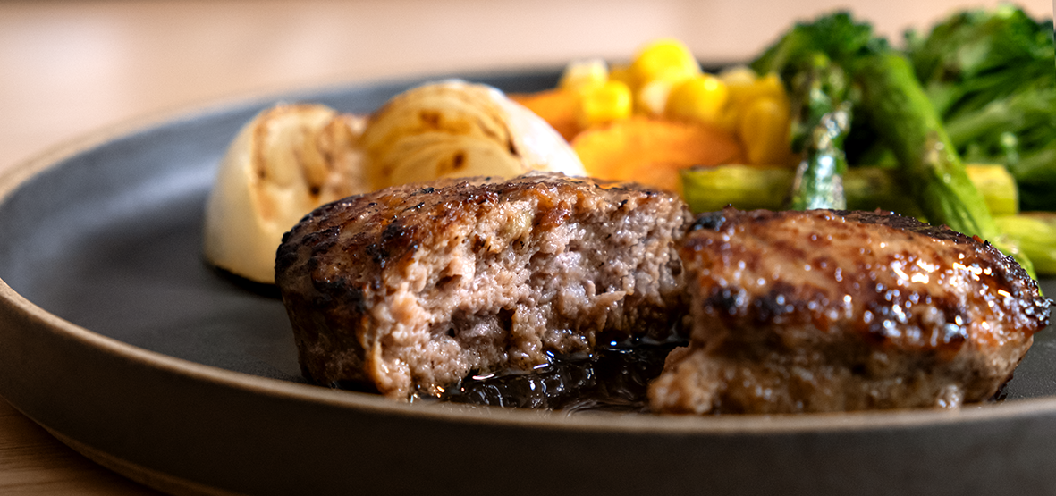 和牛は甘みと口どけが強いですが、より美味しさを際立たせる為にオージービーフの赤身も配合しております。さらに、甘みや柔らかさをもつ豚肉も合わせることで、旨味が引き立つハンバーグに仕上げています。