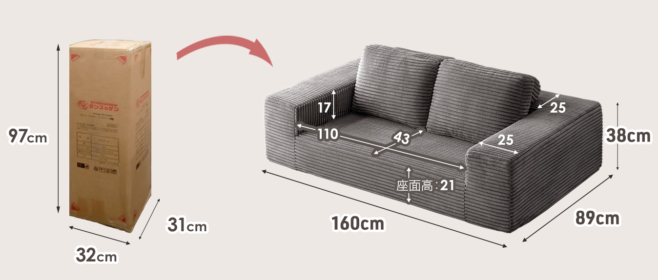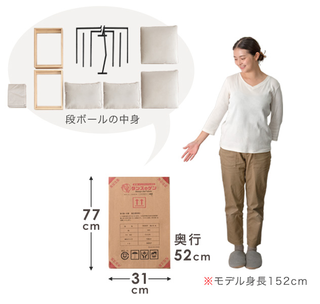また、ソファ本体を圧縮梱包し、フレーム部分を組み立て式にすることで、【高さ77cm×幅31cm×奥行52cm】の1梱包に収まるコンパクト設計を実現しています。