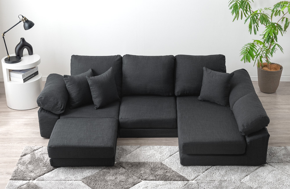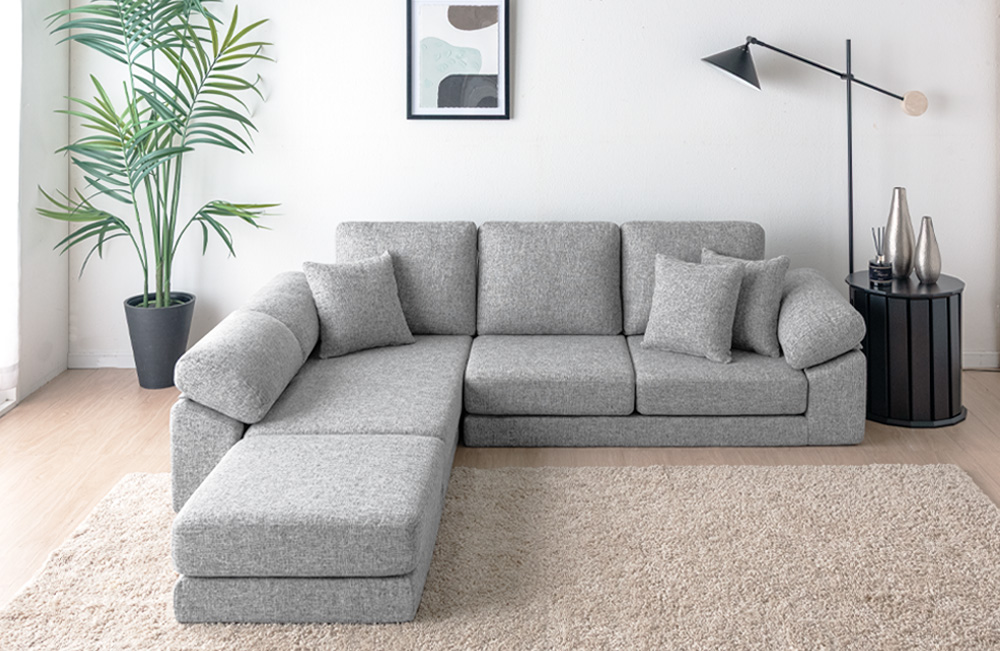 新モデルは座面高24cmのロースタイル設計で、二人掛けソファ・コーナー・一人掛けソファ・オットマンを自由に組み合わせることができます。