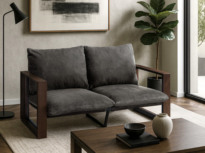 本製品は、天然木の肘掛けフレームと直線的なスクエアフレームを組み合わせることで、温もりとスタイリッシュさを両立したデザインに仕上げています。