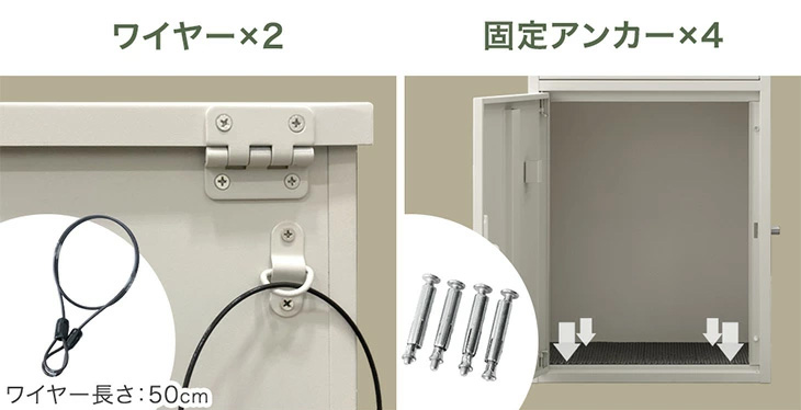 固定アンカーボルト(4本)、固定ワイヤー(2本)、宅配業者様向け指示マグネット、