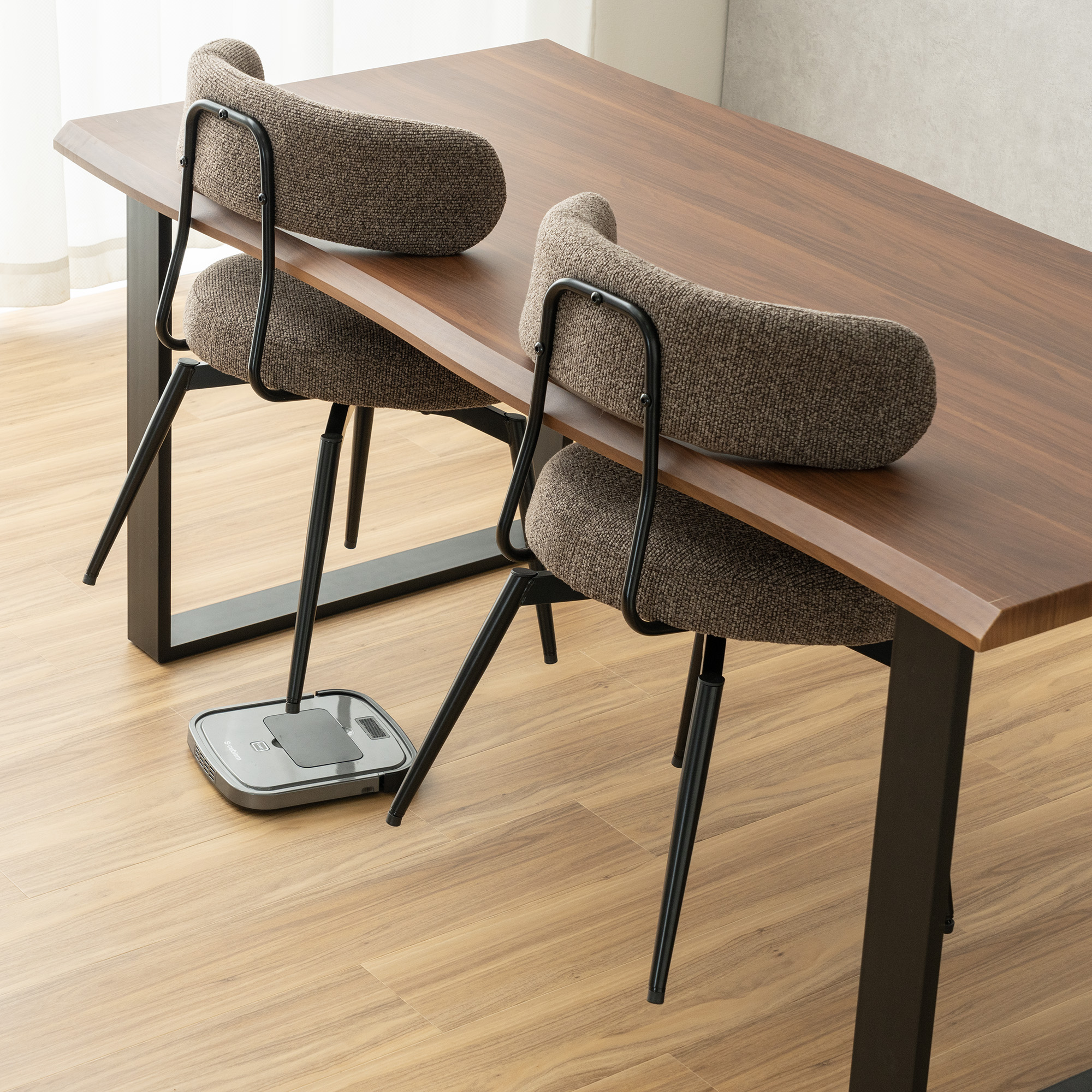 ハンギングチェアは、肘掛けや背もたれをテーブル天板に掛けるだけで、脚を床から浮かせて掃除ロボットが通れるスペースを確保できるチェアです。