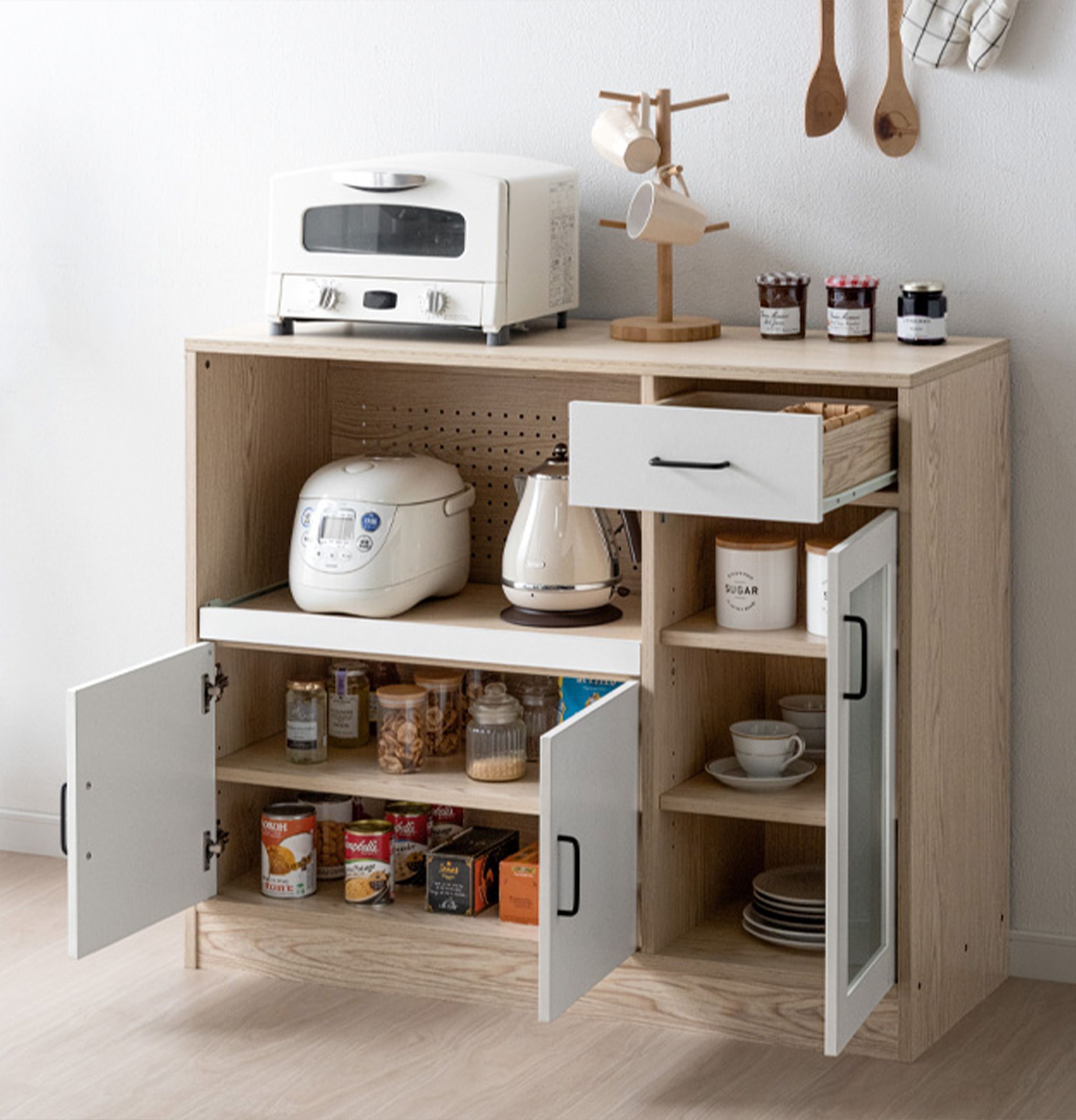 食器やグラス、調理器具などサイズの異なるアイテムもまとめて収納でき、収納物に合わせた柔軟なレイアウトが可能です。