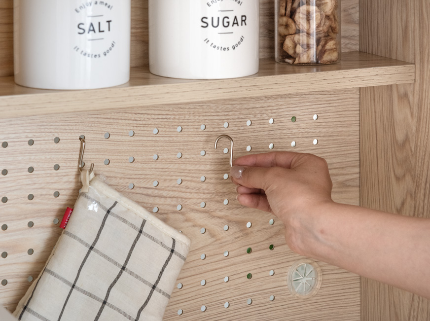オープン収納とスライド棚の背面には有孔ボードを採用しています。100円ショップなどで購入可能なフックを取り付けることで、キッチンツールや小物を自由にアレンジして収納できます。