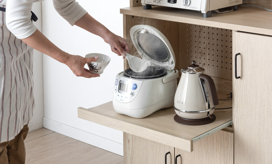 炊飯器や電気ケトルを使用する際は引き出して使用することで、発生する蒸気を逃がしやすく、家電を安心して使用できます。使用しない時は棚を収納できるため、食事の際なども邪魔にならず、キッチンをすっきり保てます。