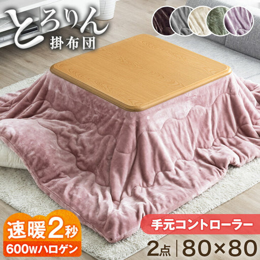 [2点セット] 80×80cm 正方形 こたつテーブル + とろりん掛け布団 洗える こたつ用布団 手元コントローラー付き〔68140120〕