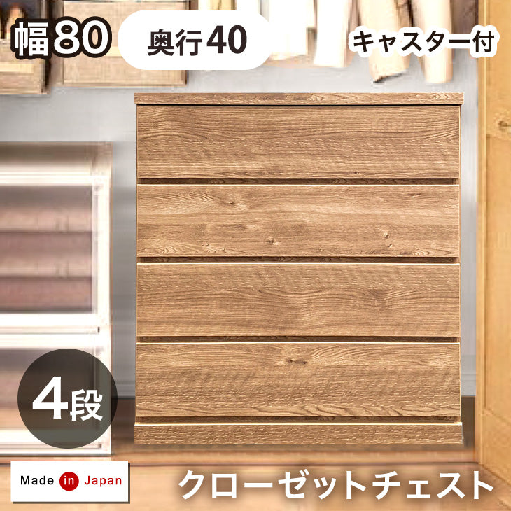 奥行40cm キャスター付き クローゼットチェスト 4段 幅80 完成品 日本製 チェスト クローゼット収納〔17100031〕