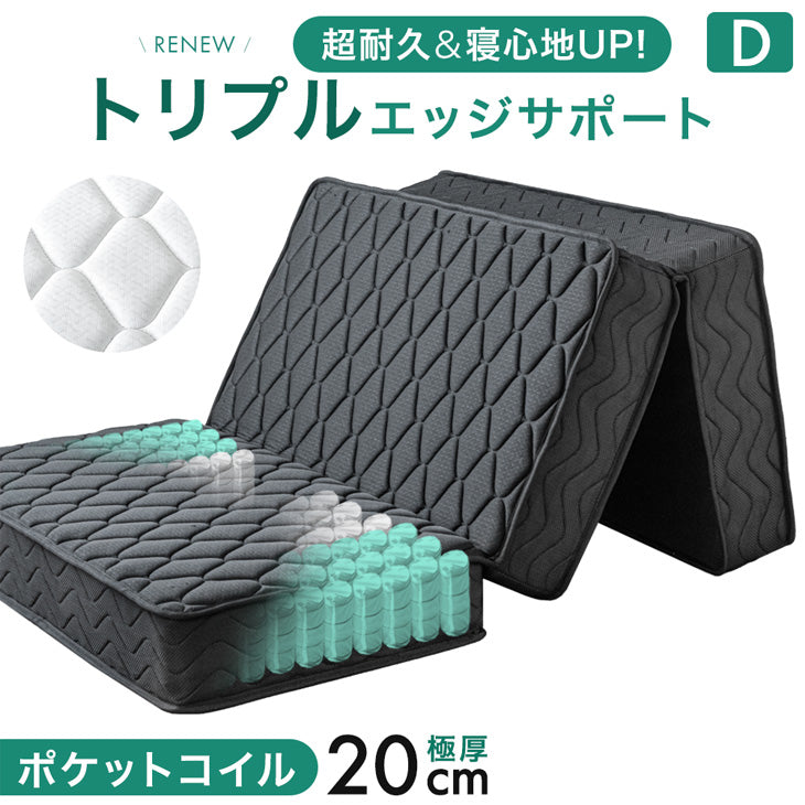 [ダブル]RENEW ポケットコイルマットレス 三つ折り 極厚20cm 体圧分散 メッシュ 通気性 ウレタン トリプルエッジサポート 圧縮 折りたたみ〔05190005〕