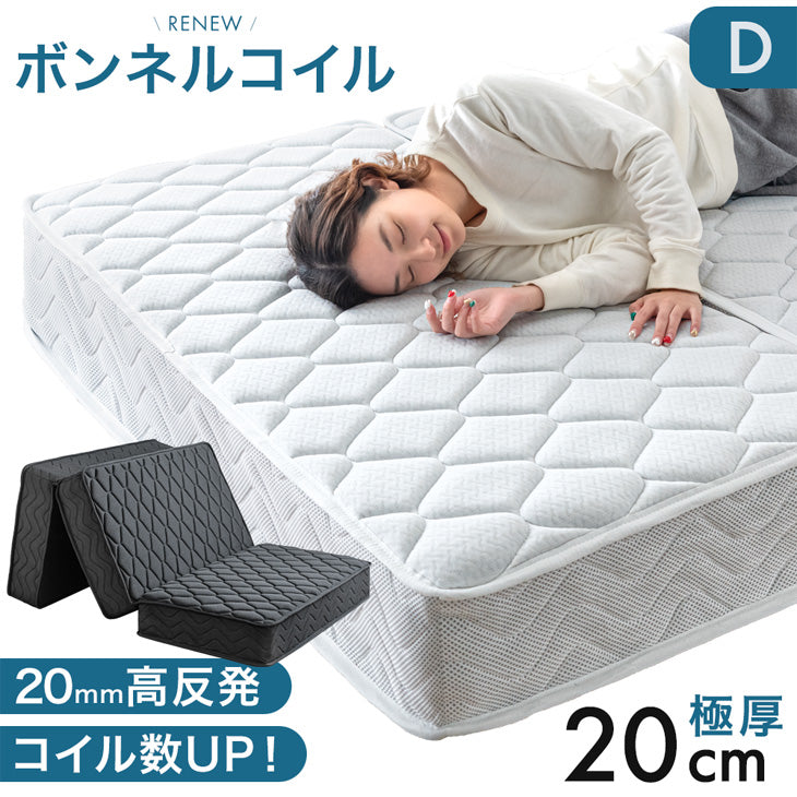 [ダブル]RENEW コイル数UP ボンネルコイルマットレス 三つ折り 高密度 通気性 ウレタン 圧縮 硬め 高反発 折りたたみ〔05190006〕