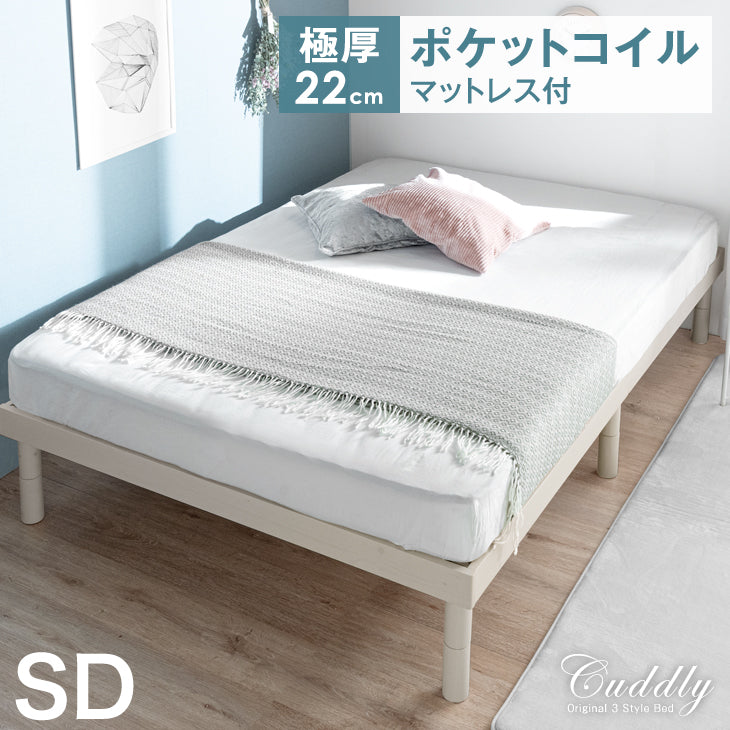 [セミダブル]マットレス付き ベッド 3段階高さ調節 天然木 すのこ ポケットコイルマットレス ベッドマットレス コイルマットレス ベッドフレーム ローベッド 〔11719163〕