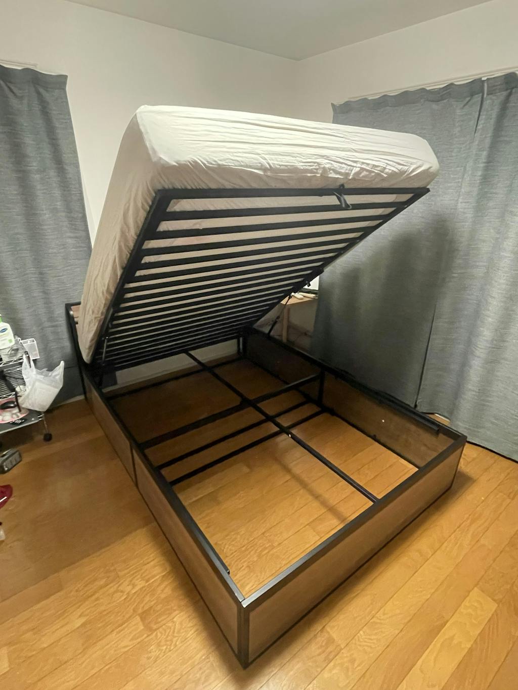※組み立て直後はシリンダー内のガス圧が高くなっており、床フレームを下げるのに力が要る場合があります。強めの力で下げていただくか2人以上で垂直した方向に力をかけるとスムーズに下げることができます。