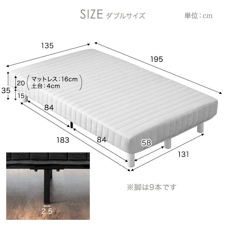 [ダブル]脚付きマットレス 頑丈タイプ 洗えるカバー付 ボンネルコイル 抗菌 防臭 高反発 エコテックス 圧縮梱包〔17800074〕