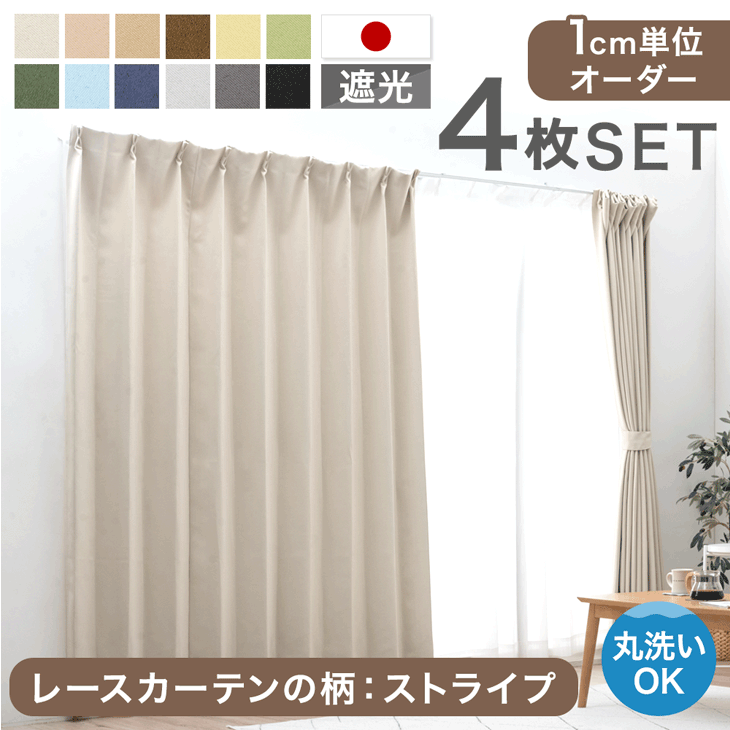 オーダーカーテン 4枚セット 日本製 遮光カーテン 1級 2級 遮熱ミラーレス おしゃれ 防音 遮音 断熱【レースカーテンの柄:ストライプ】〔22700043〕