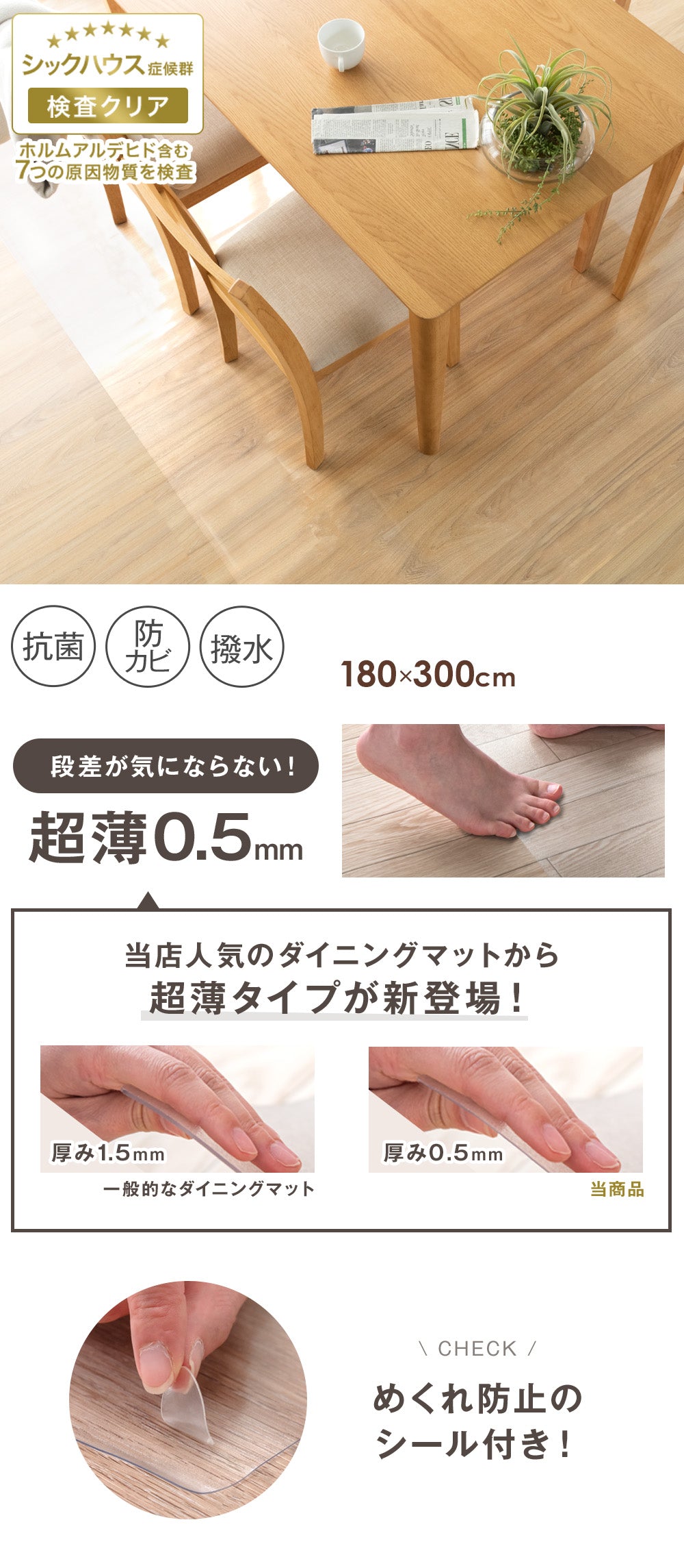 [180×300cm] 超薄0.5mm 透明ダイニングマット 撥水 クリア 抗菌 防カビ シックハウス対策済み 床暖房対応〔31800088〕