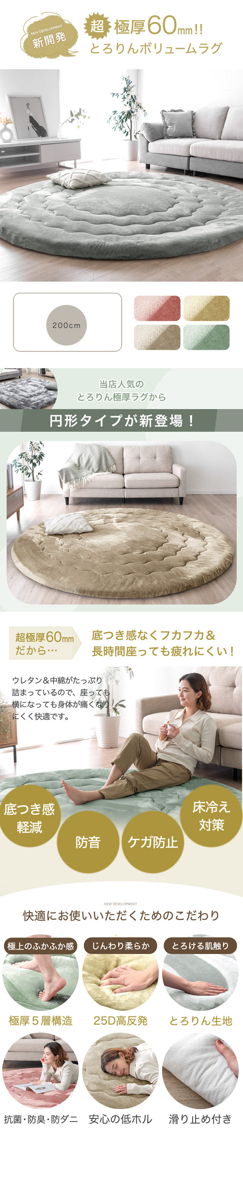 【在庫一掃プライス】[200cm]超極厚60mm とろりんラグ 円形 極細マイクロファイバー ホットカーペット対応 ラグマット 高反発 フランネルラグ 絨毯 防音 抗菌〔61100127〕