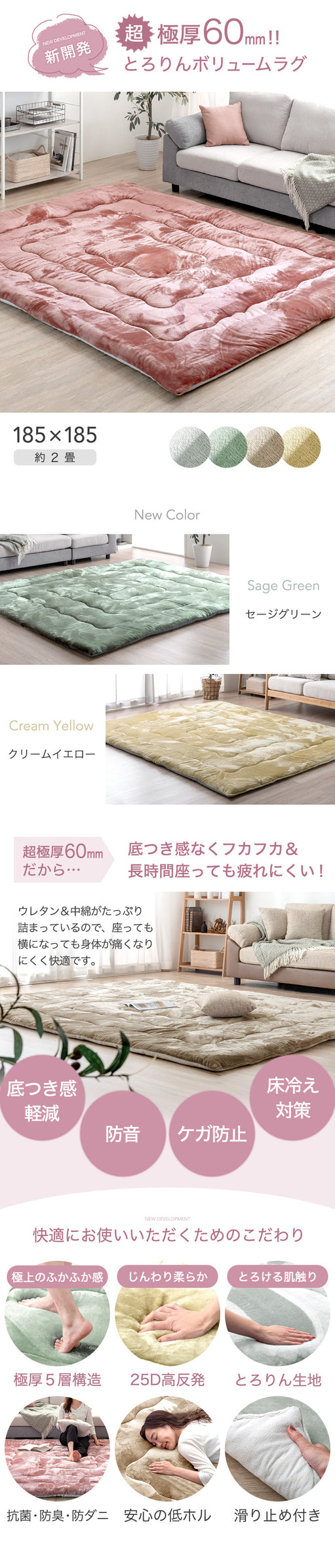 [185×185] 超極厚60mm とろりんラグ 2畳 とろけるような肌触り 極細マイクロファイバー ホットカーペット対応〔65010009〕